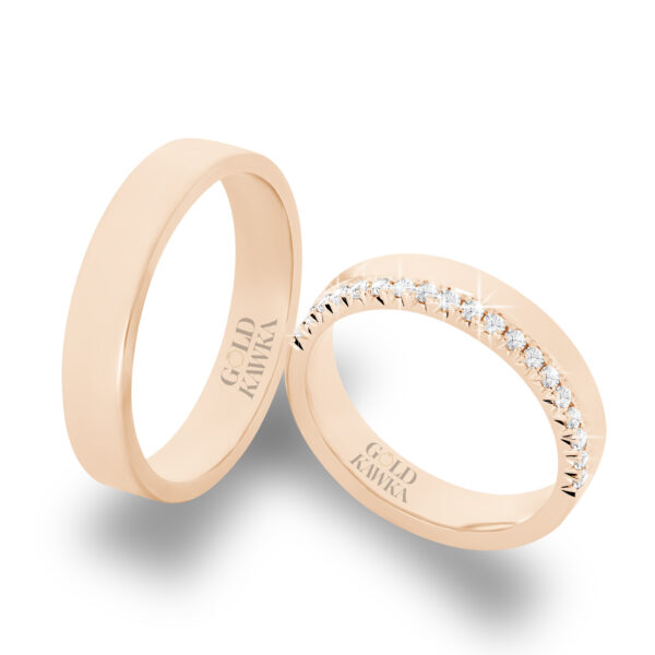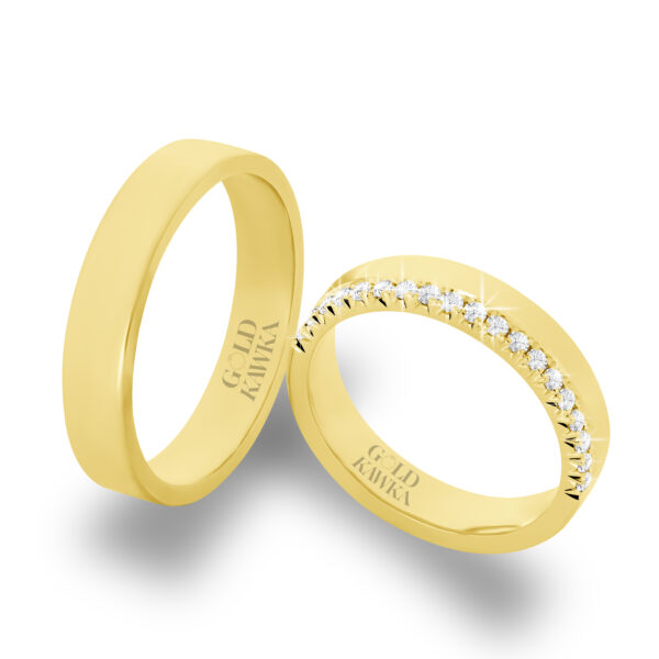 Najmodniejsze obrączki ślubne wykonane zostały z żółtego złota w próbie 585. Obrączki ślubne z brylantami w najmodniejszej oprawie typu fishtail. Ta oprawa kamieni jest bardzo efektowna. Obrączka męska w profilu lekko półokrągłym a damska obrączka dodatkowo wysadzana brylantami. Para obrączek idealnie dopasowana do siebie. W pracowni Gold Kawka obrączki ślubne wykonywane są na indywidualne zamówienie, co daje możliwość dowolnego doboru koloru złota oraz innych parametrów obrączki. Podana cena jest kwotą orientacyjna za obrączki i nie stanowi oferty handlowej w rozumieniu art. 66 kodeksu cywilnego.