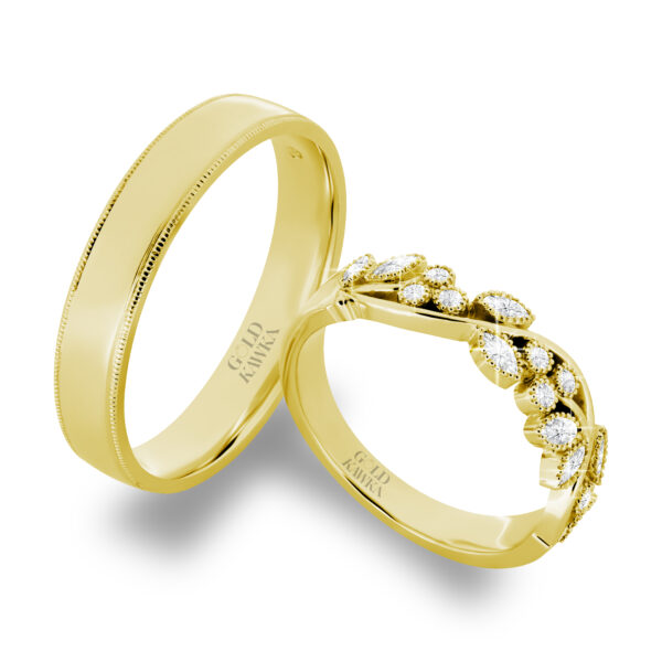 Jednokolorowe obrączki wykonane z żółtego złota.To obrączki o nieszablonowym wyglądzie. Damska obrączka z motywem kwiatowym i diamentami. Jej kształt i forma nawiązują do natury, a towarzyszące jej diamenty nadają finezji i elegancji. Męska obrączka o profilu lekko półokrągłym z milgryfem. To zestaw dla osób ceniących sobie oryginalność. Sięgnij po obrączki z pracowni Gold Kawka, a poczujesz się elegancko i modnie. Podana cena jest kwotą orientacyjna za obrączki i nie stanowi oferty handlowej w rozumieniu art. 66 kodeksu cywilnego.