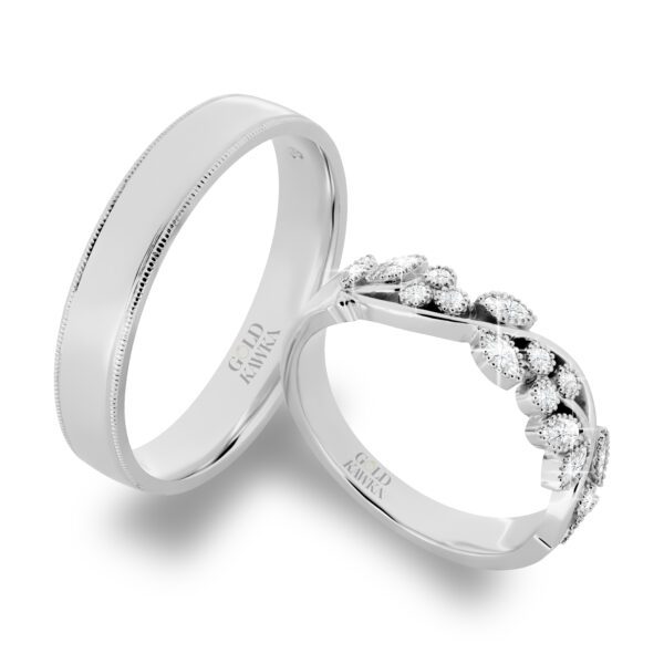 Obrączka ślubna damska z motywem kwiatowym i diamentami, męska z milgryfem
