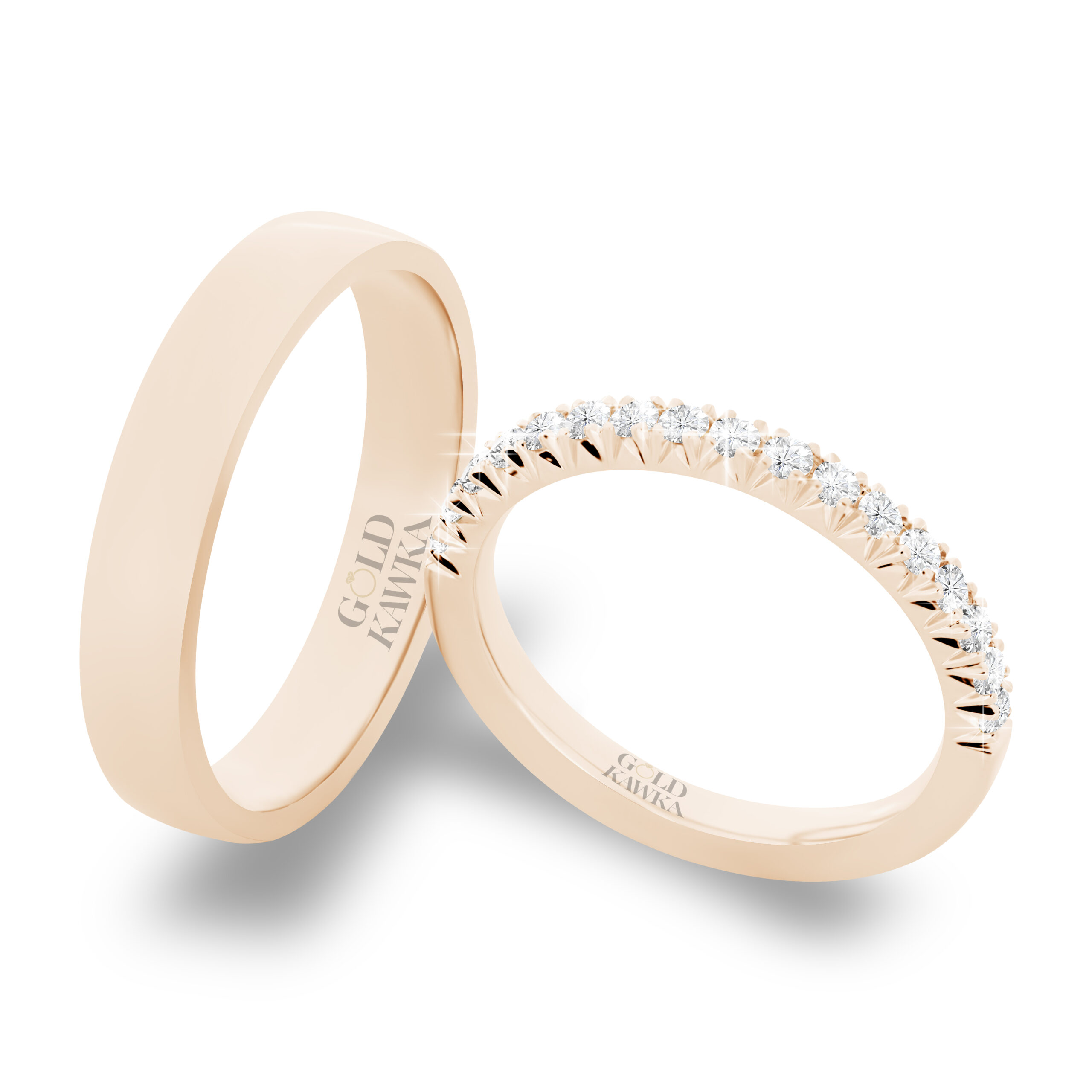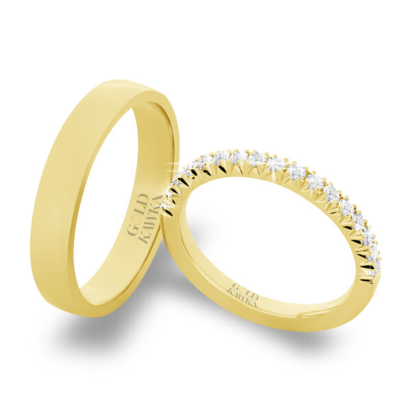 Obrączki ślubne wykonane zostały z żółtego złota w próbie 585. obrączki ślubne z brylantami, oprawa typu fishtail, która jest bardzo efektowna. Obrączka męska w profilu płaskim a damska obrączka dodatkowo wysadzana brylantami. Para obrączek idealnie dobrana do siebie. W pracowni Gold Kawka obrączki ślubne wykonywane są na indywidualne zamówienie, co daje możliwość dowolnego doboru koloru złota oraz innych parametrów obrączki. Podana cena jest kwotą orientacyjna za obrączki i nie stanowi oferty handlowej w rozumieniu art. 66 kodeksu cywilnego.